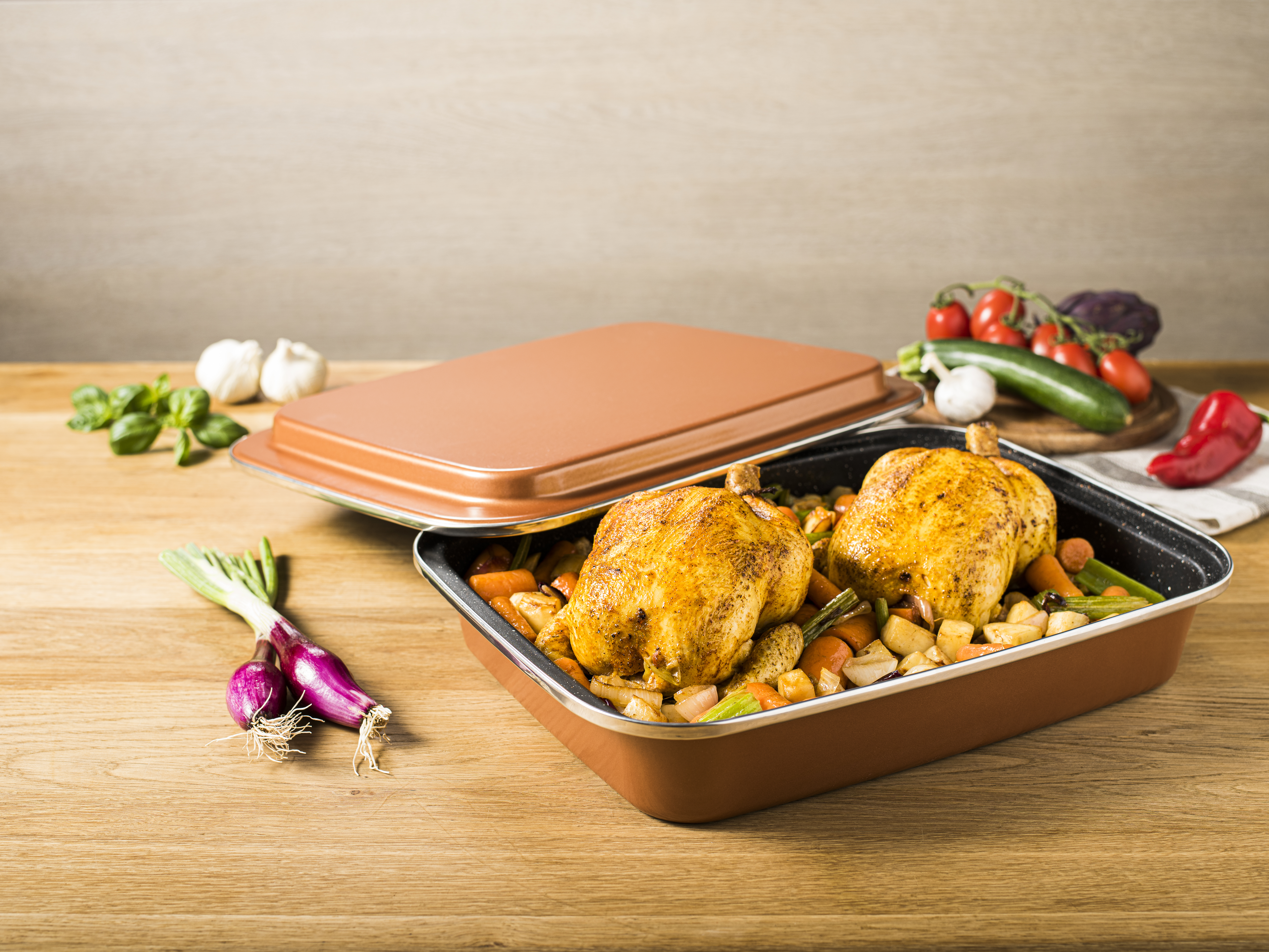 Či už chcete upiecť celé kurča, hovädzinu alebo chrumkavé zemiaky či variť na pare, vyprážať, pripraviť musaku alebo upiecť koláč - v tomto všestrannom pekáči budú Vaše jedlá určite úspechom. Sada obsahuje hlboký pekáč (40x30x7) a plytký plech (41,3x31,3x3) a jeho XXL veľkosť zaručuje dostatok miesta pre veľké jedlá.
